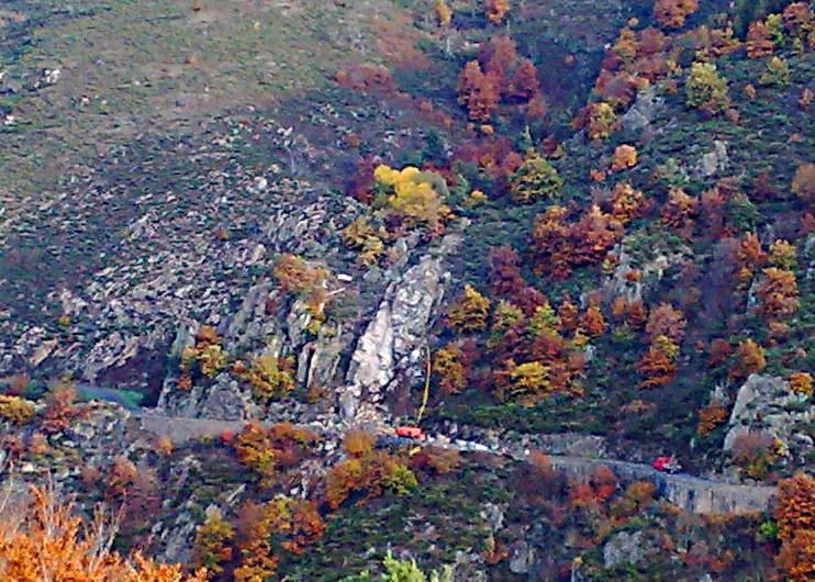 24 octobre 13h00 : la purge des rochers a commencé tout au moins sur la paroi surplombant la route. Enfin, on dirait...