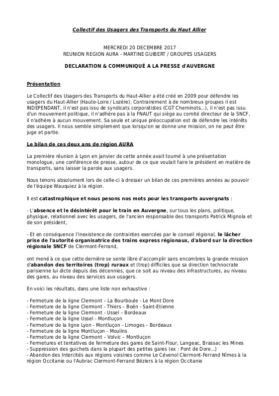 Le Collectif des Usagers des Transports du Haut-Allier a été créé en 2009 pour défendre les usagers du Haut-Allier (Haute-Loire / Lozère). Contrairement à de nombreux groupes il est INDEPENDANT, il n’est pas issu de syndicats corporatistes (CGT Cheminots...), il n’est pas issu d’un mouvement politique, il n’adhère pas à la FNAUT qui siège au comité directeur de la SNCF, il n’adhère à aucun mouvement. Sa seule et unique préoccupation est de défendre les intérêts de s usagers. Il nous semble simplement que lorsqu’on se donne une mission, on ne peut être juge et partie.