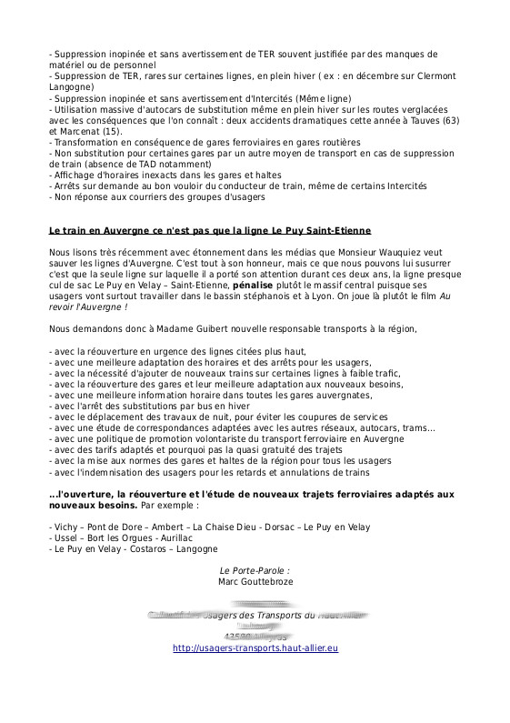 - L’absence et le désintérêt pour le train en Auvergne, sur tous les plans, politique, physique, relationnel avec les usagers, de l’ancien responsable des transports Patrick Mignola et de son président,