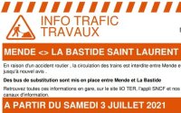 Le trafic est interrompu entre Mende et Labastide « jusqu’à nouvel ordre » dit la SNCF dans sa fiche horaires à partir du 3 juillet.