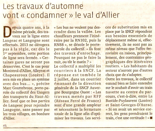 – notre demande de remplacement des bus par un train navette dépendrait des régions. C’est entendu et nous posons la question aussitôt aux régions Auvergne et Languedoc Roussillon.
