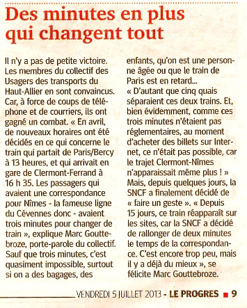– aucune solution n’est en vue pendant les travaux à la gare de Clermont pour le changement de train sur le meme quai lors de la correspondance entre le train de Paris Bercy de 13h00 et le TER vers le sud à 16h40,