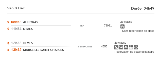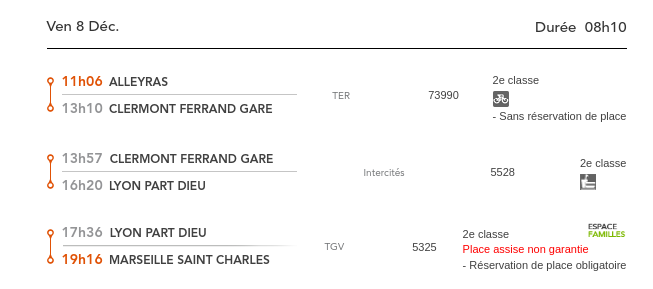 Hormis le fait que sur la ligne du train Cévenol, Clermont-Ferrand Nîmes des TER et Intercités sont SUPPRIMES sans avis de plus en plus fréquemment, comme ce jeudi matin le TER de Clermont à 6h47 ou l’Intercités Cévenol dimanche 3 décembre, hormis ces caguades qui deviennent habituelles, retour 6 ans en arrière avec ce que nous dénoncions en 2011 : voici le billet et le trajet qui nous est proposé lorsqu’on demande un billet direct Alleyras Marseille :