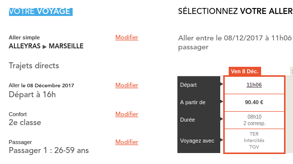 Que des voleurs à Oui SNCF. Oui mais en précisant de quelle sorte de DIRECT on veut parler ça pourrait peut-être s’arranger ? C’est exact, les talentueux informaticiens de la SNCF ont besoin de précisions et d’amour, le direct pour eux, c’est faire une grosse boucle, ils veulent nous garder, nous prendre en otage, un petit allongement du trajet du double de kilomètres. Alors en cochant « modifier le trajet » précisons donc que le direct entre Alleyras et Marseille pour nous ça passe à Langogne :