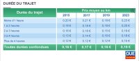 Le mieux est de juger de vous-même de ses effets pervers : même à l’intérieur du pays les tarifs au kilomètre varie du simple au double selon les régions ou les liaisons. Pour les trajets de moins d’une heure ils sont par exemple moins chers en Bretagne, plus chers dans la vallée du Rhône et l’Est du pays (tableau 2). Ils sont au mieux de 0,10 euros au kilomètre pour les longs trajets contre 0,17 pour les courts. Au pire de 0,17 pour les longs à 0,36 pour les courts !