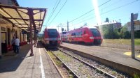 La Bastide Saint-Laurent les Bains, sa gare au centre. On y distingue deux rames de TER Occitanie en provenance de Mende :