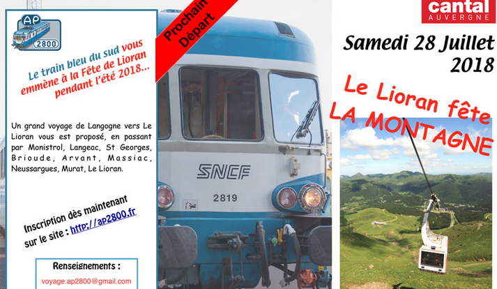 Pour la fête de la Montagne l’association AP 2800 organise un voyage le 28 juillet sur une journée entre Langogne et Le Lioran, passage dans les gorges de l’Allier et de l’Alagnon, des paysages somptueux... Avec un autorail mythique le X 2809.